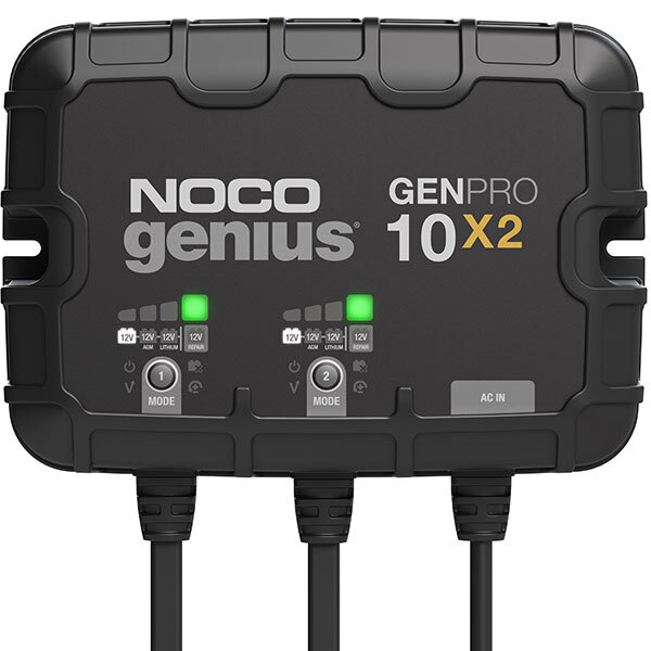 Meet the all-new GENPRO10X2. Similar to our GEN2, only better. It's 19% smaller and delivers 33% more power. It's one of the best performing onboard marine battery chargers we have ever made. A two-bank onboard battery charger rated at 20-amps (10-amps per bank) for 12-volt batteries, including marine, boat, starter, and deep-cycle batteries. Independently charge and control each battery bank with selectable charging modes - including 12V, 12V AGM, 12V Lithium, and 12V Repair Mode - for all types of lead-acid and lithium-ion batteries.